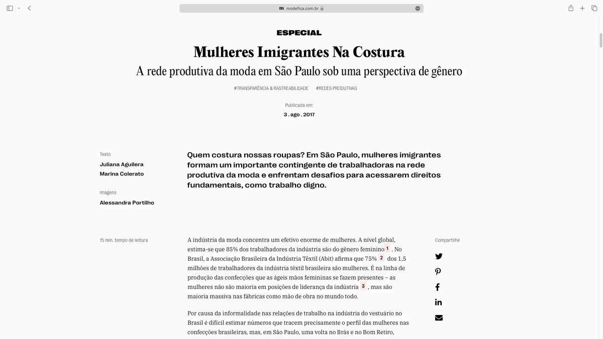 Até mesmo nas reportagens especiais sobre os imigrantes na área da costura em São Paulo, não encontramos recortes de gênero que sejam satisfatórios para entender os problemas que atingem especificamente as mulheres dentro dessa cadeia produtiva. Parece não haver espaço para essas mulheres protagonizarem uma pauta que é igualmente delas. Quem melhor do que elas mesmas para nos contar por que imigraram, por que ficaram aqui, as relações dentro das oficinas, a relação com a sociedade brasileira, o medo, o desconforto e o abuso que sofreram e sofrem por serem mulheres e imigrantes?