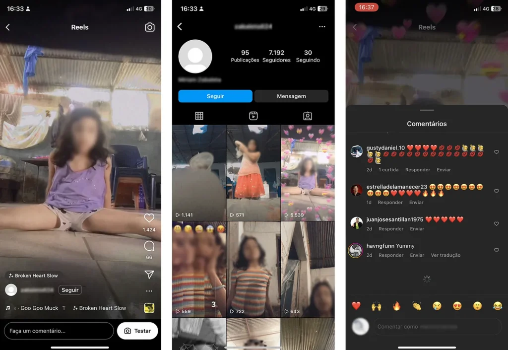 Na rede social da Meta, diversos conteúdos e contas do tipo não são removidos mesmo após repetidas denúncias por não serem imagens explícitas e estarem numa zona cinza – muitas são, inclusive, compartilhadas por mães e pais que nem imaginam a possibilidade do conteúdo ser utilizado dessa forma ou, que, por outro lado tiram algum benefício da “fama” digital da criança.